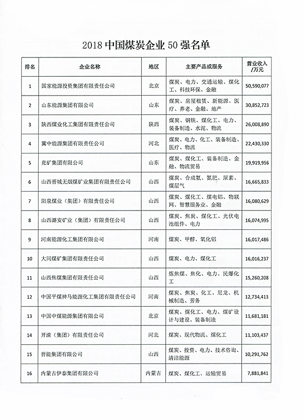 【概要描述】日前,2018年中国煤炭企业50强榜单发布。据榜单显示,国家能源投资集团有限责任公司排名第一,2017年营业收入为5059.01亿元。排名第二的为山东能源集团有限公司,2017年营业收入为3085.27亿元。陕西煤业化工集团有限责任公司排名第三,2017年营业收入为2600.89亿元。